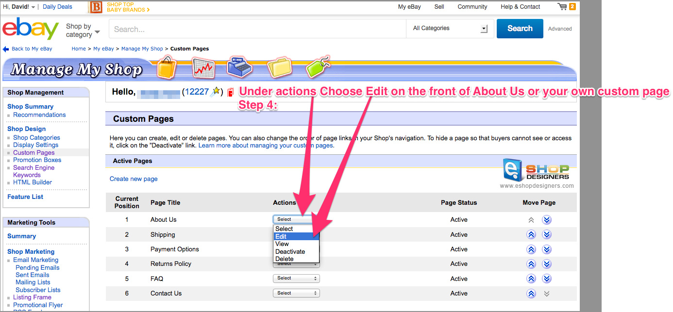 First of all, kindly login into your eBay account by using your own eBay account's username and password and then following below steps to make changes to your custom eBay pages.
