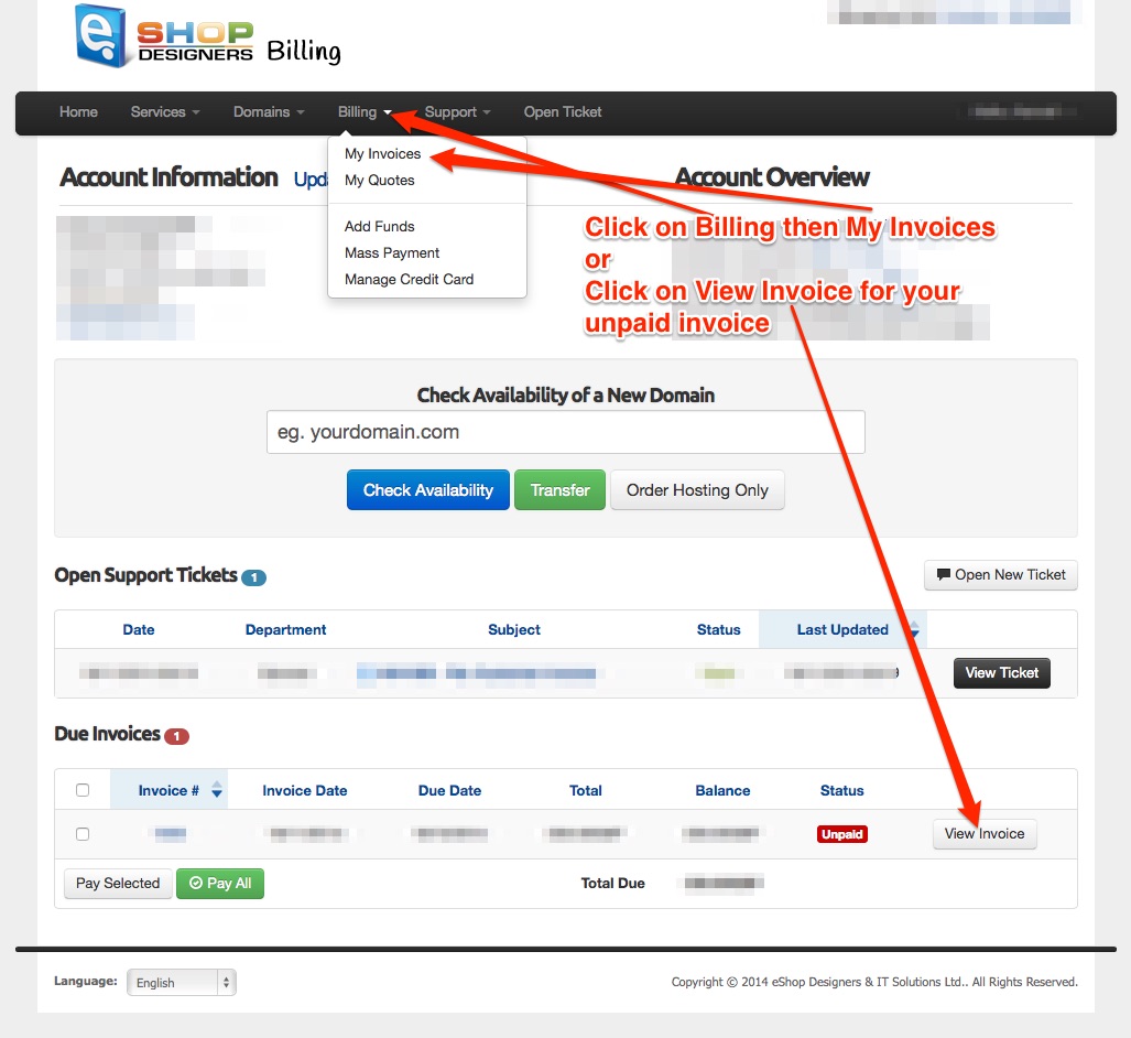 First of all, kindly login into your eShop Designer's Billing account (Click here to Login) and then follow below given steps for your required service.